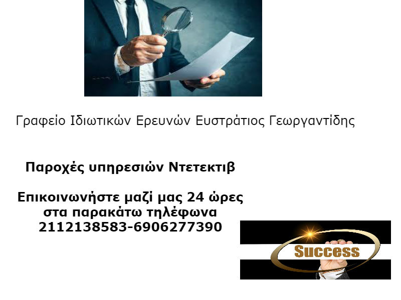 Το γραφείο μας Ιδιωτικών Ερευνών Ντετέκτιβ,διαθέτει εξειδικευμένους ερευνητές-συνεργάτες με πολυετή πείρα στο χώρο των ερευνών.Διαθέτουμε άριστο τεχνολογικό εξοπλισμό.Είμαστε στην διάθεσή σας 24 ώρες το 24ωρο.